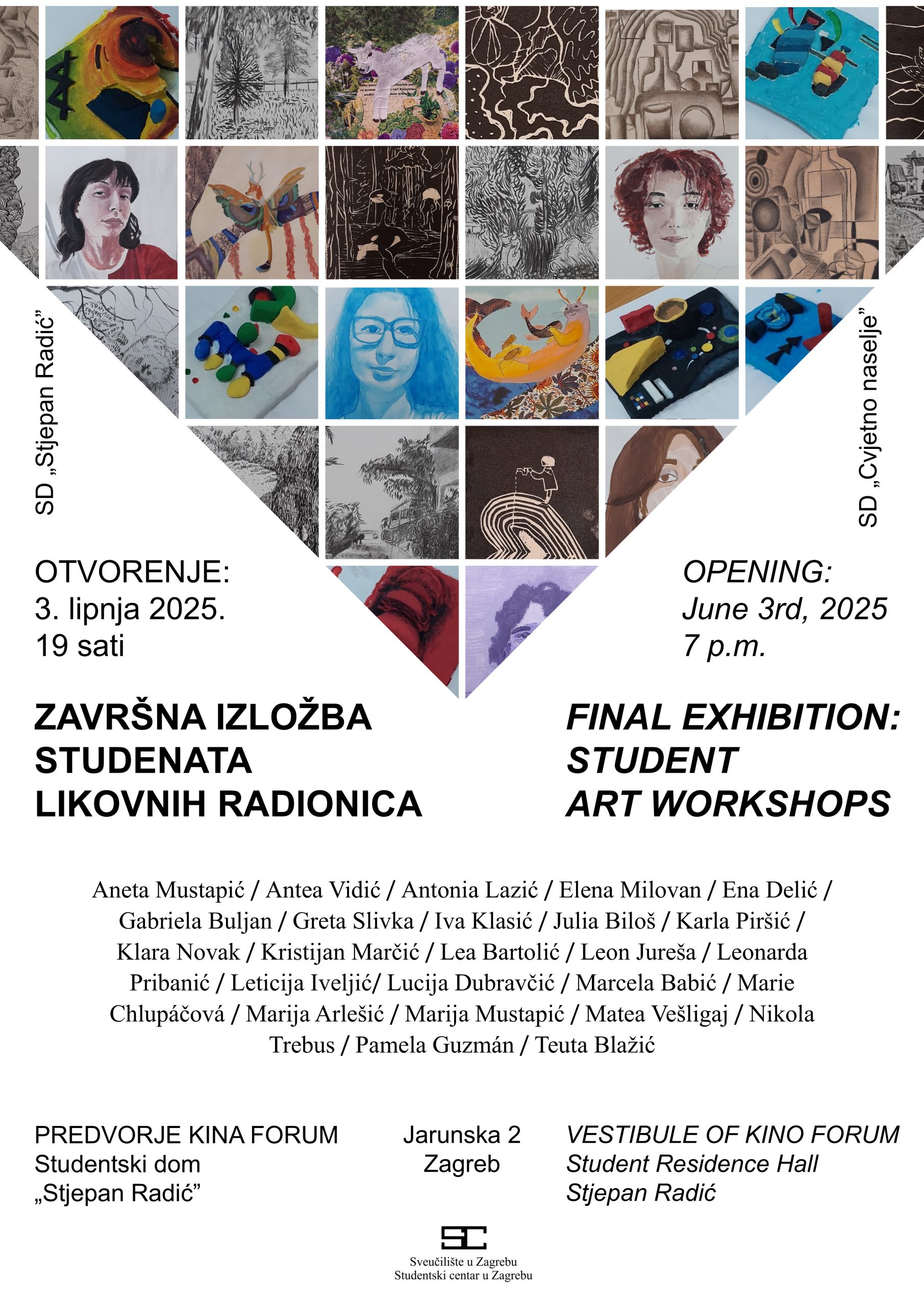 Pozivamo Vas na otvorenje završne izložbe studentskih radova naših dviju radionica koje će se održati u utorak 3. lipnja u 19 sati, u predvorju Kina Forum, Jarunska 2 (Studentski dom Stjepan Radić). Radovi su rezultat kontinuiranog kreativnog i posvećenog rada studenata s različitih fakulteta. Radionice su se održavale u SD-u Stjepan Radić i u SD-u Cvjetno naselje pod vodstvom univ. mag. educ. art. Petre Kovačić.